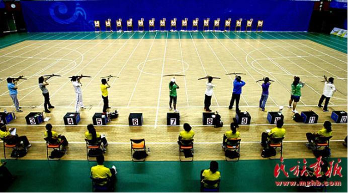 第三届全国少数民族运动会上云南选手参加射弩比赛。