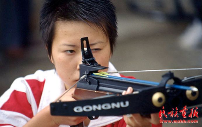 箭在弦上。第六届全国少数民族传统体育运动会女子民族标准弩比赛