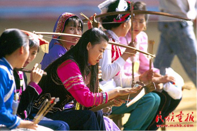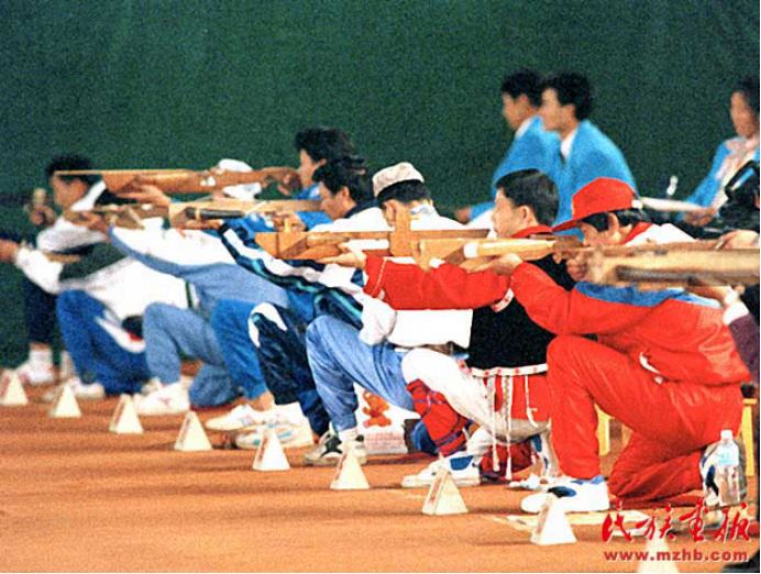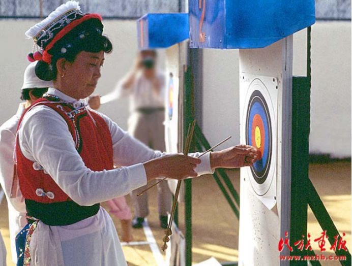在第二届全国少数民族传统体育运动会上射弩还是表演项目,来自云南和广西的选手在一起切磋技艺。