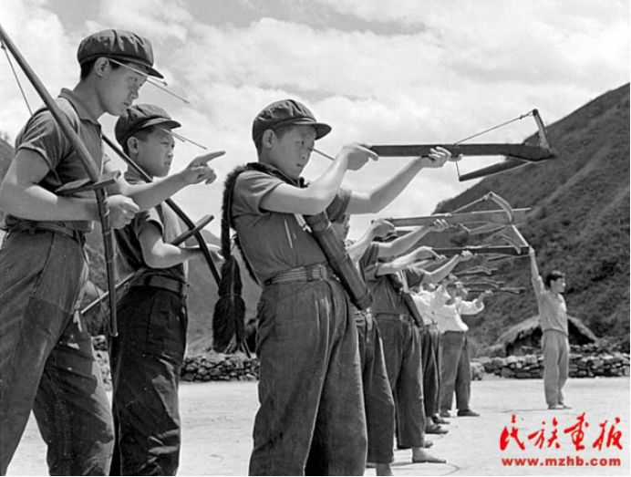云南省贡山独龙族怒族自治县第四中学学生在比赛射弩。(1978年)