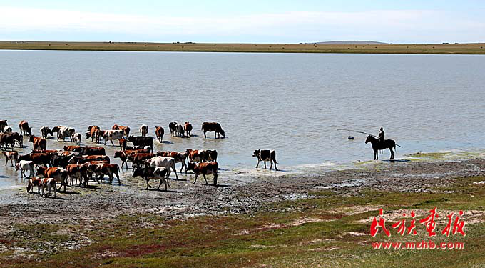 扎拉森尼玛赶着牛群在银阿木吉湖饮水。